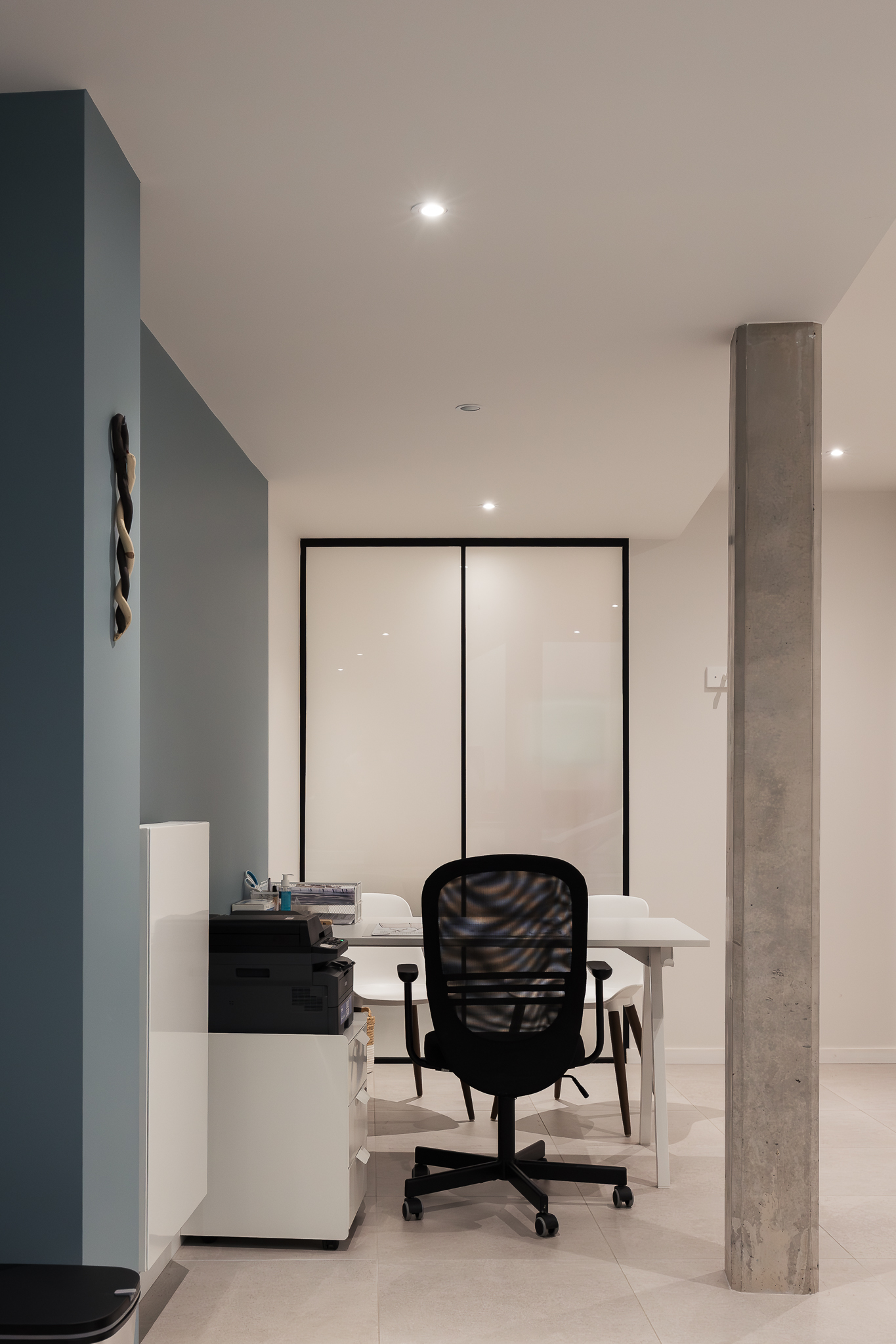 L’aménagement des quatre cabinets s’est articulé autour des imposantes colonnes existantes, intégrant harmonieusement ces éléments structurels dans un design sobre et épuré. Une attention particulière a été portée à la luminosité, notamment pour les espaces situés en sous-sol. Grâce à un jeu de transparence, incluant un plancher en verre et des parois vitrées en partie supérieure des cloisons, la lumière naturelle circule librement, offrant un environnement agréable et apaisant.