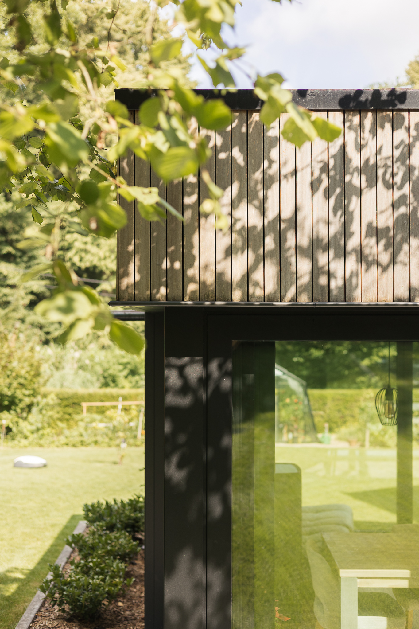 Une large ouverture vers le jardin arrière apporte lumière et transparence, offrant une continuité fluide entre l’intérieur et l’extérieur. La nouvelle cuisine bénéficie ainsi d’une vue dégagée et d’un accès direct aux espaces extérieurs.